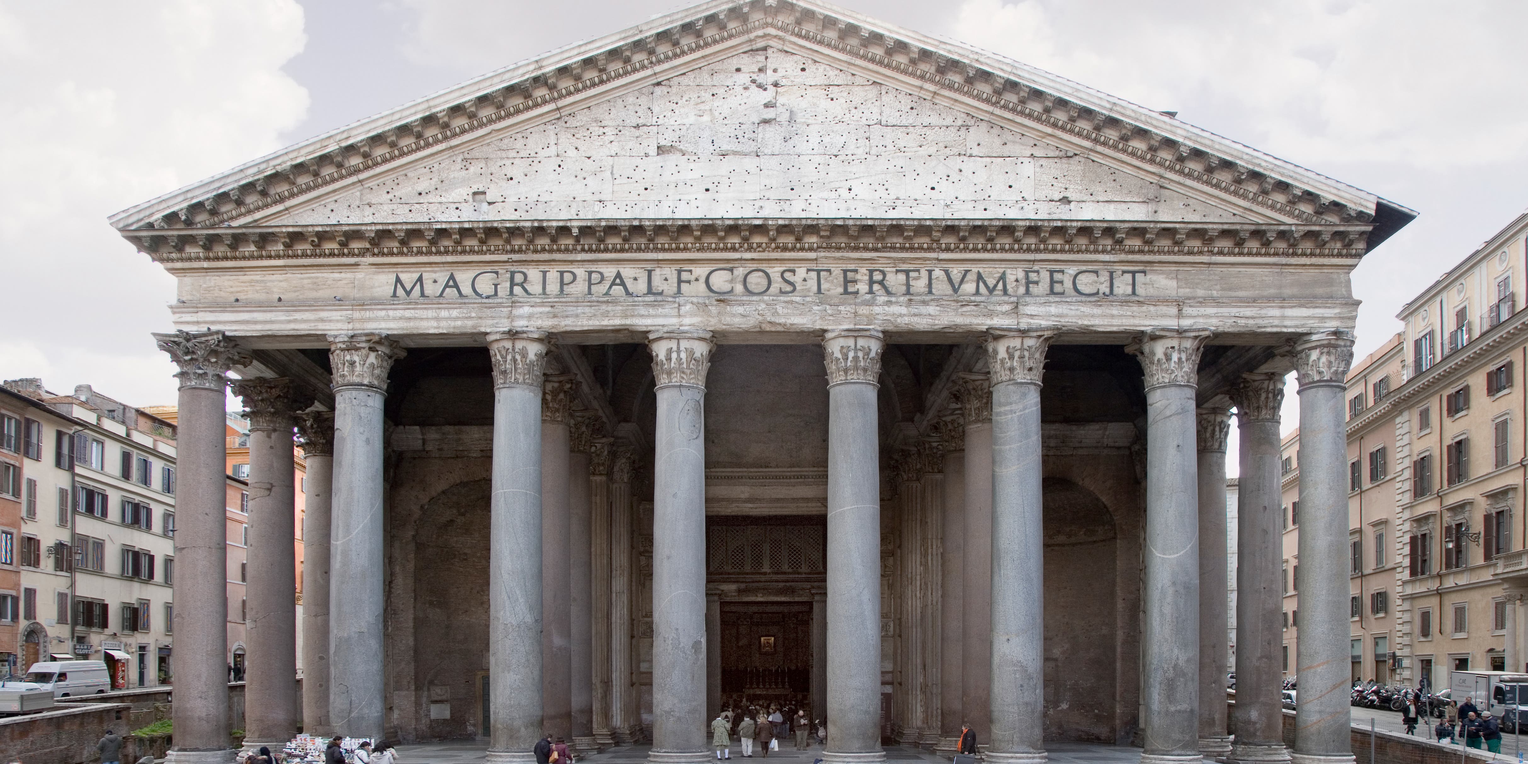 An inscription in Latin on the architrave reads in English: “Marcus Agrippa son of Lucius built this while consul for the third time”.