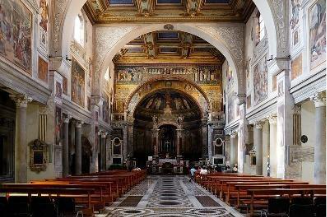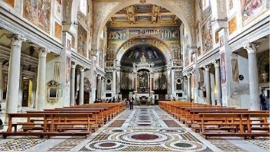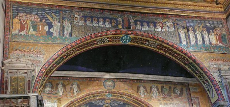 Two mosaic-clad arches represent an unusual feature of the church. The first separates the transept and body of the church from the apse which the second, the triumphal arch and the apse holds 8th century mosaics displaying the monogram of Pope St Paschal. The Second Coming of Christ and the End of Time described colorfully in the Book of the Apocalypse constitute the basic themes of the mosaics.
