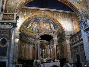 Santa Prassede is a 9th century basilica built over a much earlier 6th century church whose origins extend back to a legendary account according to which St. Pudens, a Roman senator, provided hospitality to St. Peter during his first century stay in the City. Christians dedicated this church to Prassede, one of two martyred daughters of Pudens. A nearby church is dedicated to the other daughter, St. Pudenziana. The church of San Prassede provides visitors with an unusually good visual account of early 9th century architectural and artistic media: mosaics, fresco painting, and sculpture.