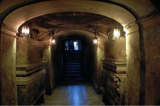 At the confessio under the altar, a staircase leads to the crypt where two pairs of ancient Christian sarcophagi sit on top of each other. The relics of Saints Prassede and Pudenziana rest in the sarcophagus on the lower right. The others contain the remains martyrs moved here from the catacombs. Fragments of paleo-Christian tombs line the semi-circular corridor behind the altar, itself a fragment from the first basilica.