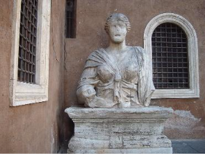 The bust of Madame Lucrezia, a fragment from the Temple of Isis Campense near the Pantheon, sits on the outside corner of church. Historians believe that the figure represents Isis herself and this because of her hair style, dress, and the amulet resting on her breast. The Madame achieved great renown as one of the City’s six famous talking statues (Pasquino, Abbate Luigi, Babuino, Marforio, Facchino), and the only female among them, who spoke frequently to the Capitoline’s Marforio and to Piazza Navona’s Pasquino figure. Originally, she sat on a pedestal but, in the late 18th century, vandals toppled her over and broke her into pieces to which, reportedly, she declared, ‘I’ve had enough’. Later restored, she now rests on a much shorter perch.
