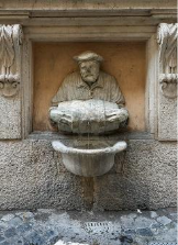 On a side street (current Via Lata) which runs along the side of the church stands a very old City fountain and one of its five ‘talking Roman statues’. Il Facchino (porter), stood once on the Via del Corso as a monument to Abbondio Rizi, a 16th century porter (aquarolo), famous in his day for the amount of weight he could carry, and head of their guild (corporazione) which commissioned it. For a long time many, erroneously, believed that it was a caricature of Martin Luther, which explains the damage done by stones to his face. Only in the 19th century was it moved to this side street.