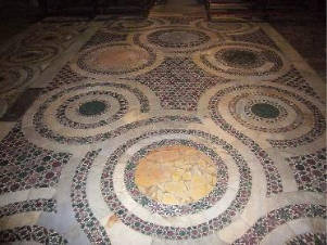 Most of the walls show brickwork except for those with 12th century fresco fragments depicting Old Testament scenes on the right side and of the Last Judgment on the left. The church retains its original Cosmatesque floor, unique in the City because untypically preserved rather than restored. Some of its precious marble pieces, made of porphyry, serpentine and granite from Egypt and Greece, are damaged, many missing and replaced with cement. It also contains medieval floor tombs of members of aristocratic families, the Mattei and the Castellani, who lived in the neighborhood.