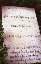 Percy Bysshe Shelley lies not far from Keats. The 29-year-old Shelley drowned in 1822 in the Gulf of Spezia during a storm that suddenly rose as he and friends sailed in a small boat. In his pocket when he died, survivors discovered a volume of Keats’s poetry. Shelley’s gravestone bears his name and the Latin phrase, “COR CORDIUM” (heart of hearts).